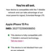 iPhone 15 Pro 128GB BLACKNOT UNLOCKED – T-Mobile Carrier LockedGreat condition for used96% Battery HealthPHONE ONLYNO BOX NO CHARGERPHONE ONLYNO RETURNS PRODUCT IS FUNCTIONAL AND WORKING CORRECTLY