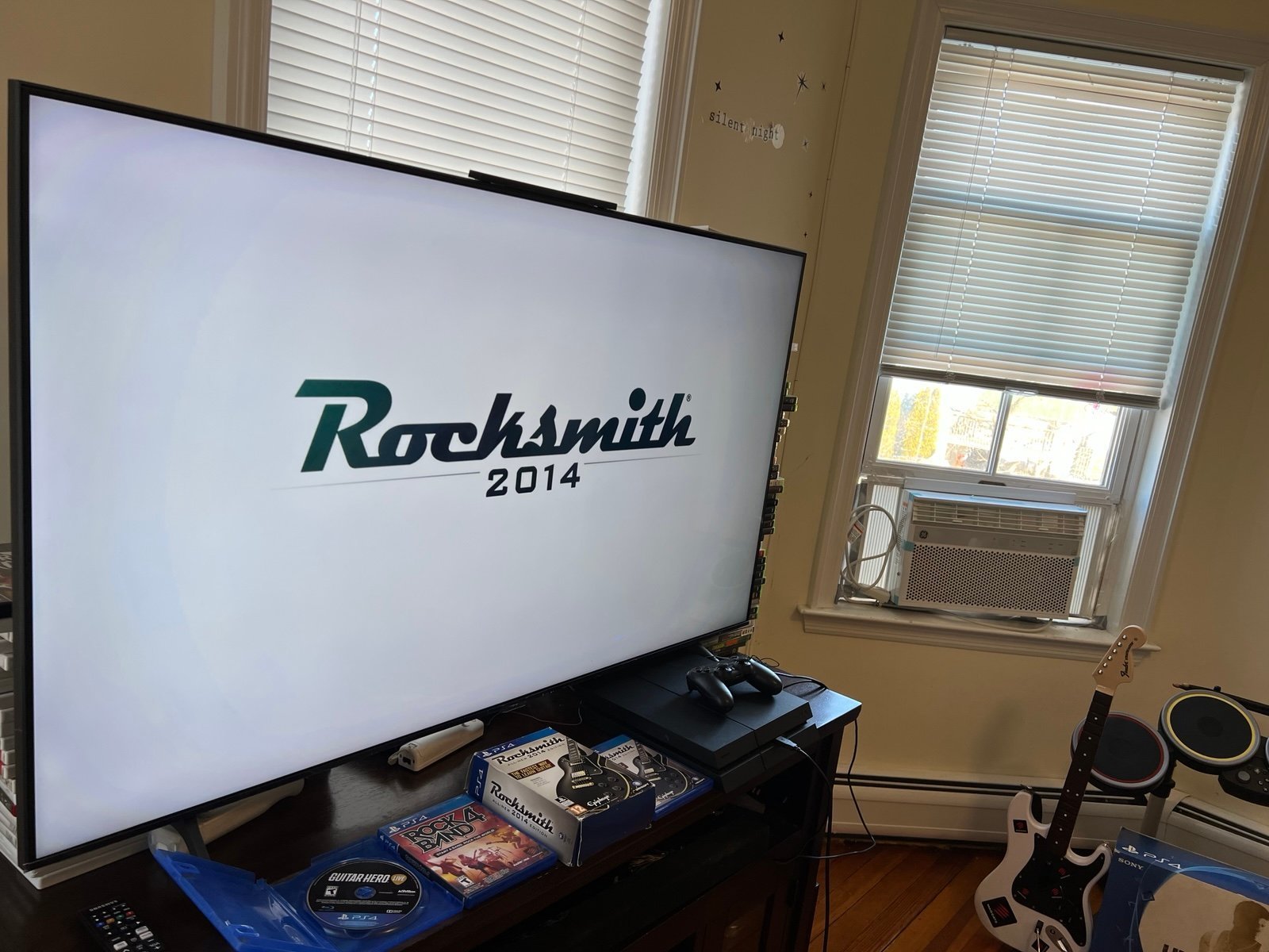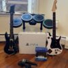 You have a super mint condition Rockband 4 Bundle, comes with drums and console in box.Whats included .Guitar hero live Guitar, with Game and dongle Rock band 4 Game Rocksmith for PS4 with cable RockBand 4 Fender Stratocaster in white Rockband 4 Drum for PS4 PS 4 console with Box Mic and drumsticks Everything has been fully tested and can be viewed in the images